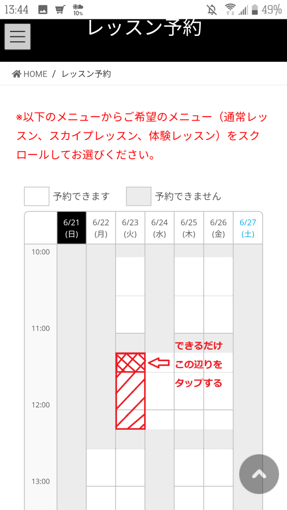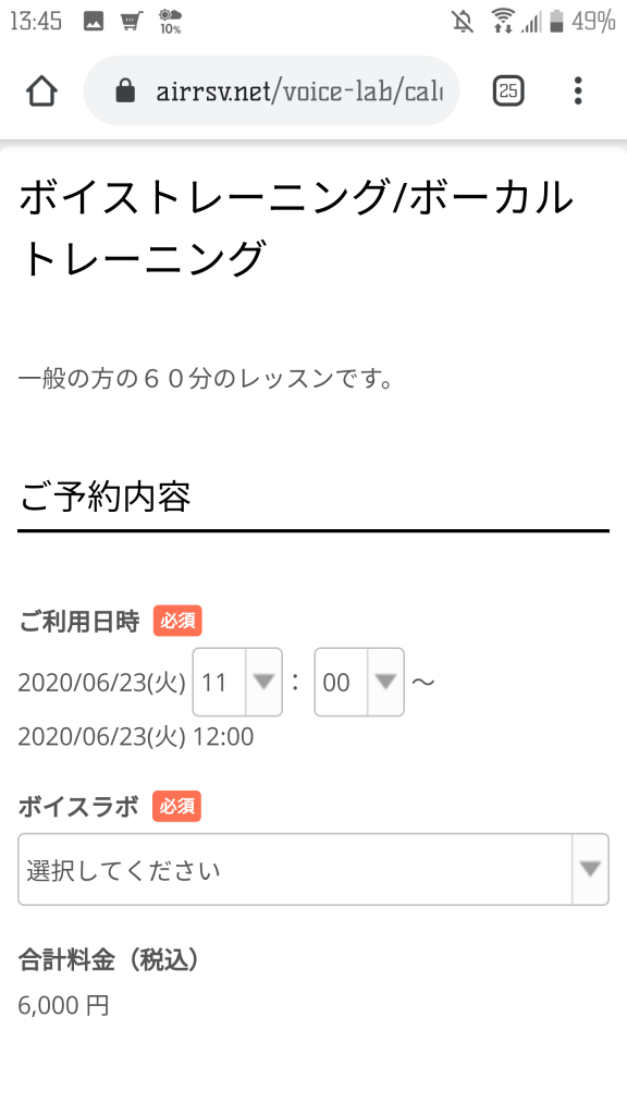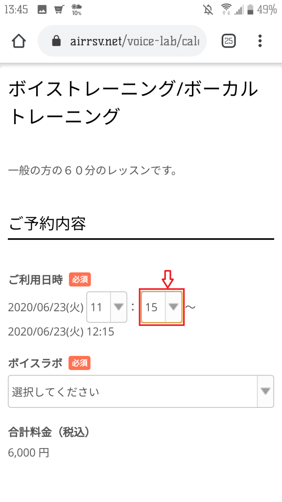 今は仮に、6/23(火)11:15〜12:15の枠を予約する場合で見てみますね。