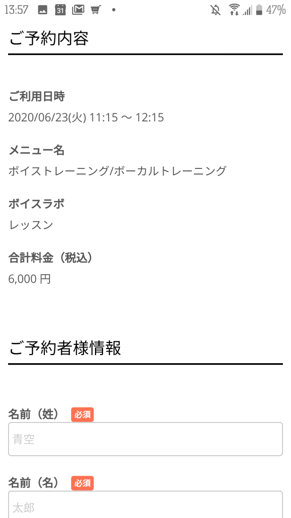 ⑤ すると「ご予約者情報の入力」というページに飛びます。