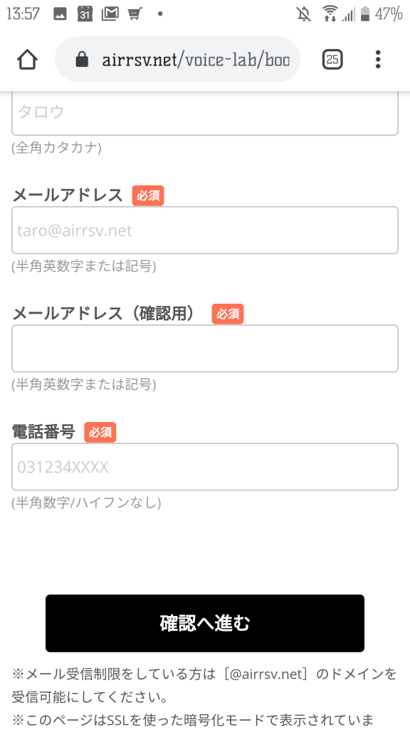 2)メール受信制限をしているか、(@airrsv.netと@voice-lab.netのドメインを受信可能にしてください)