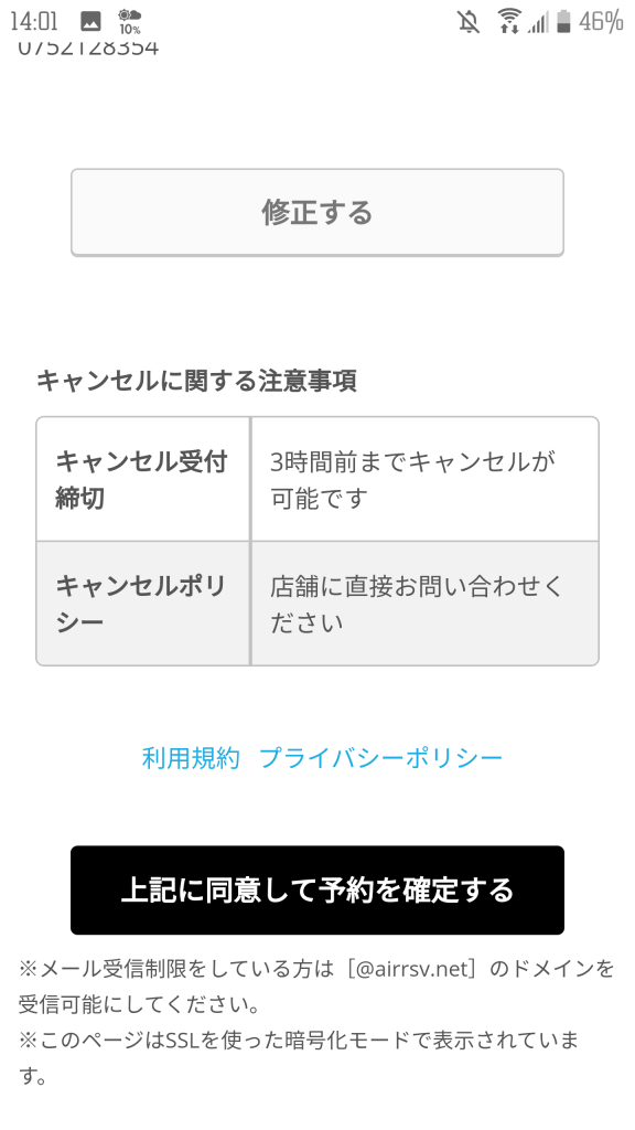⑧ 訂正するところがあれば、上の「修正する」をタップして内容を修正してください。内容に間違いがなければ、利用規約やプライバシーポリシーをご確認の上、『上記に同意して予約を確定する』をタップ(クリック)してください。