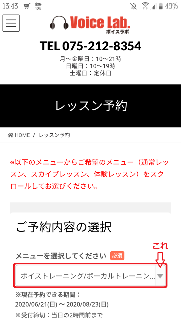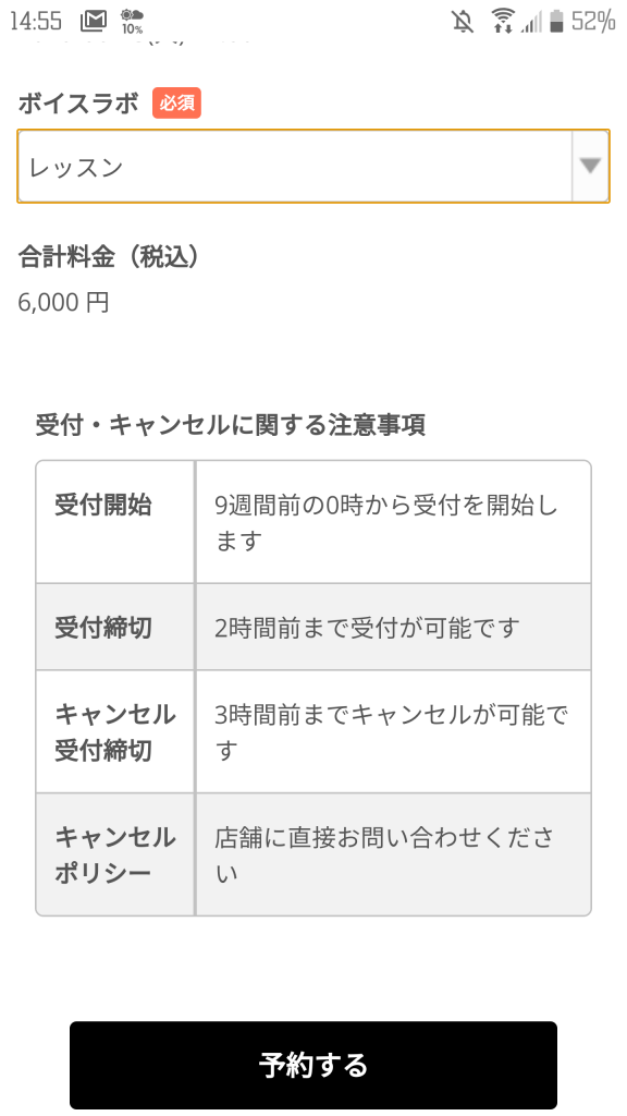 ④ ボイスラボの下の選択肢から「レッスン」を選んで、「予約する」をタップ(クリック)します。