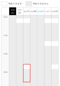 そしてスケジュールを見ながら自分が予約を取りたい枠を探してタップ(クリック)します。