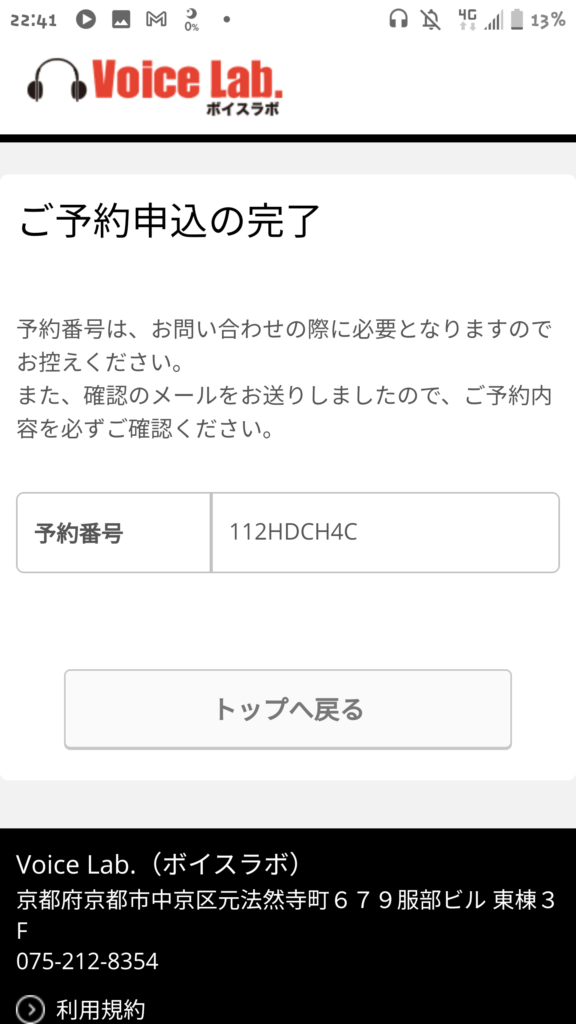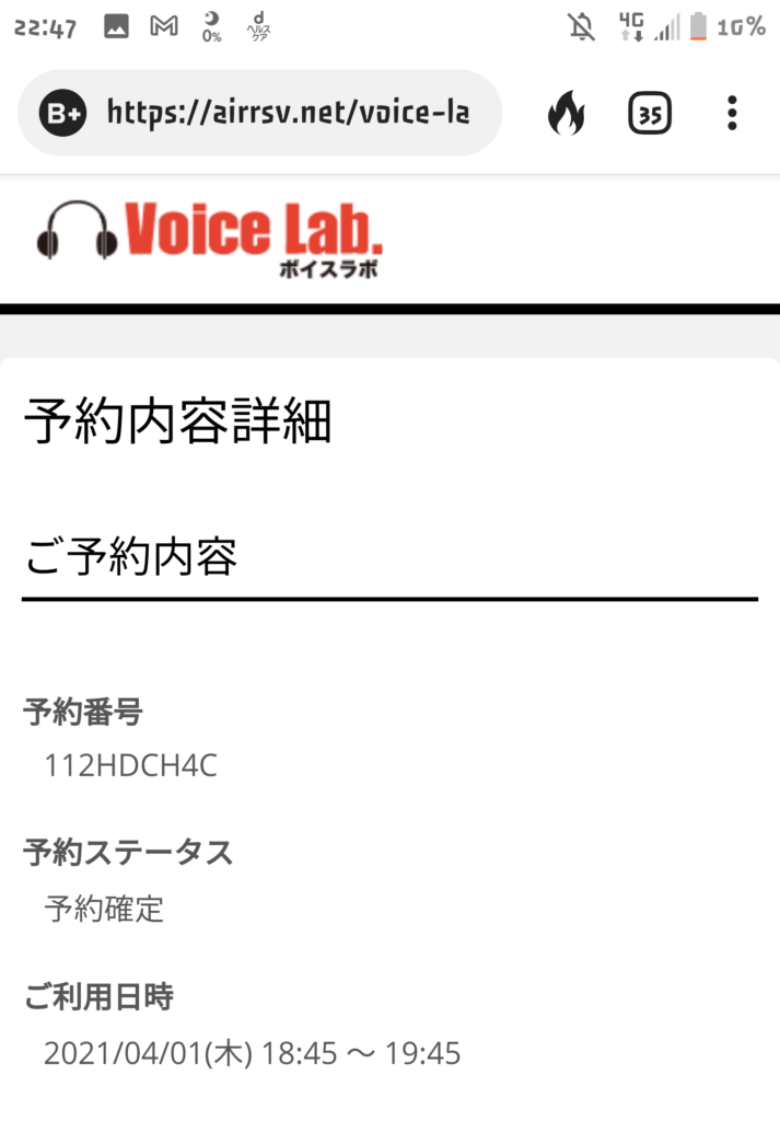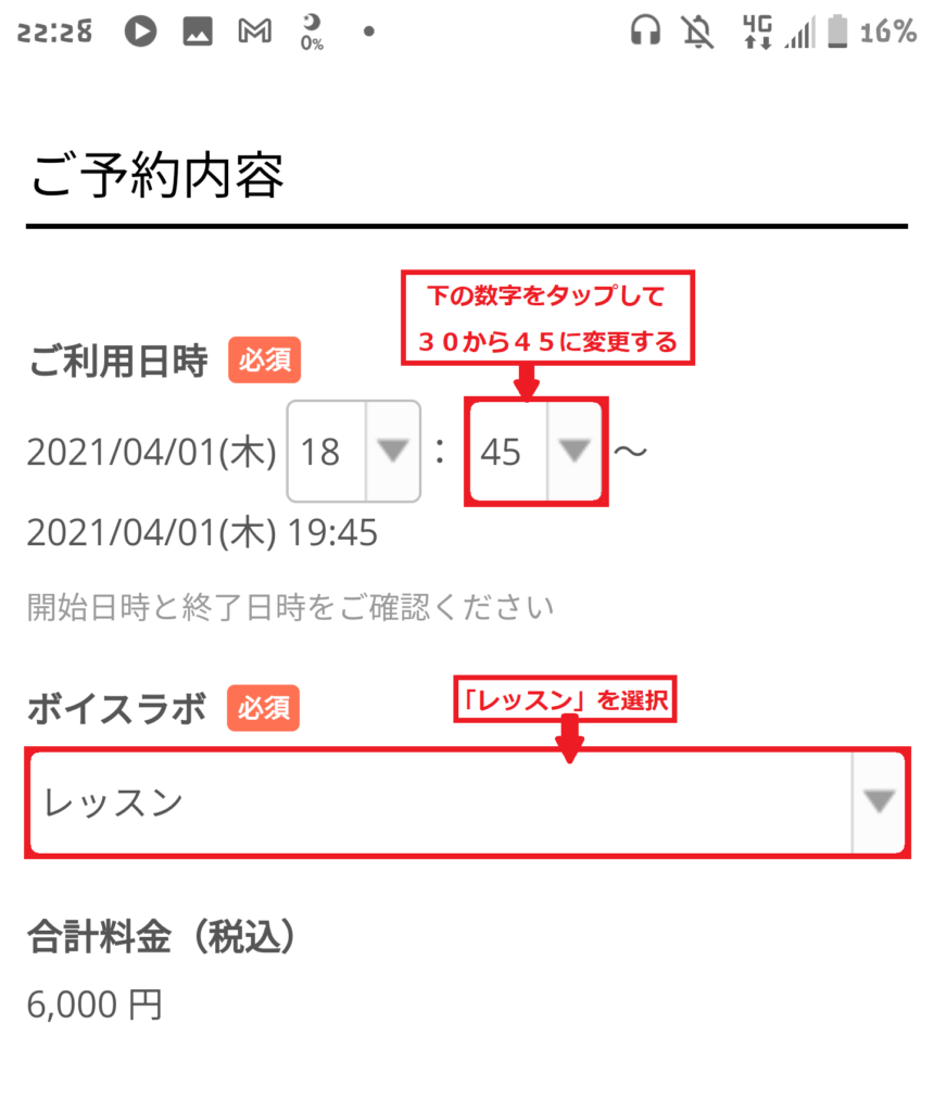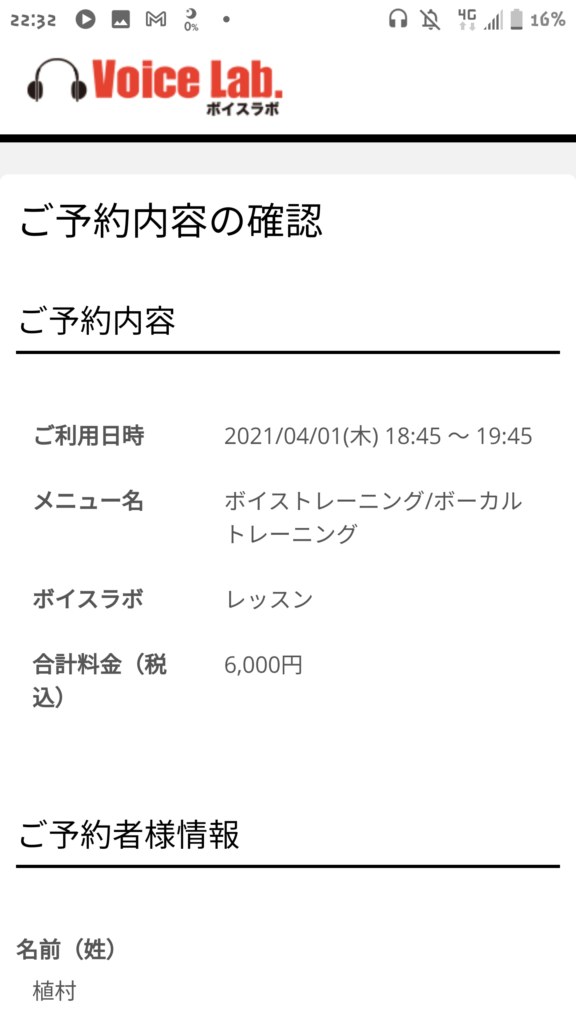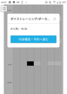 その下のボイスラボのタブで「レッスン」を選び、一番下にある『予約する』をタップ(クリック)します。