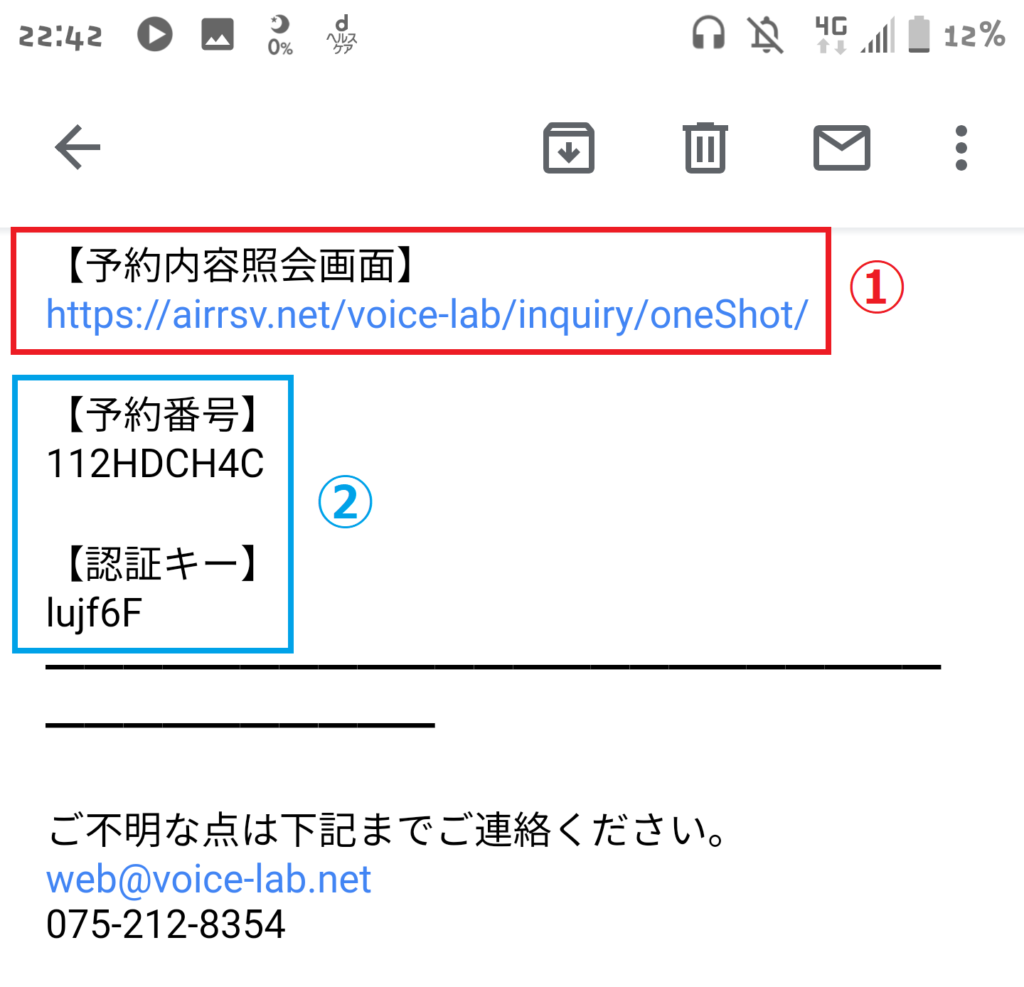 ① 予約確認メールの中にある『予約内容照会画面』のリンク(下図の赤色の①)をタップ(クリック)します。