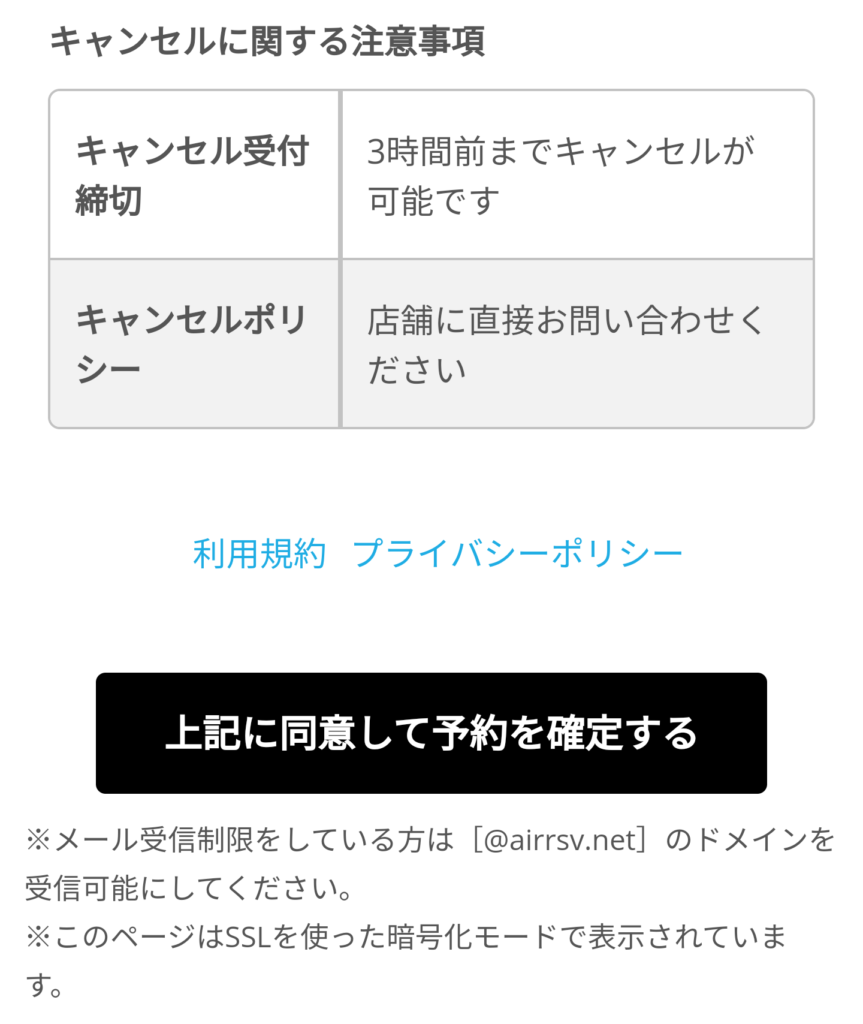 ④ 次のページで入力された内容が正しいか確認をして、もし誤りがあれば『修正する』、なければ『上記に同意して予約を確定する』をタップ(クリック)します。