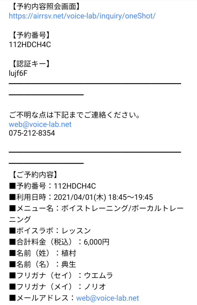 ⑥ 自動送信で予約確認のメールが送られてきます。もし、1時間経っても送られてこない場合は、メールアドレスの入力を間違えているか、キャリアメールなどでドメイン制限をしているか、予約が完了していない可能性がありますので、再度ご予約していただくか、メールにてお問い合わせください。