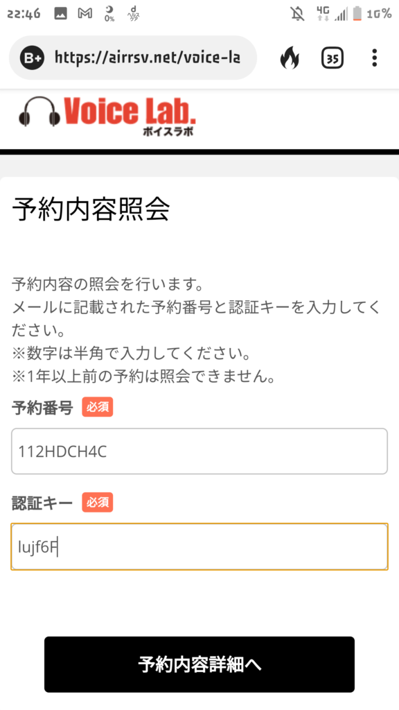② 開いたページに『予約番号』と『認証キー』(上図の青色の②)を入力し、『予約内容詳細へ』をタップ(クリック)します。