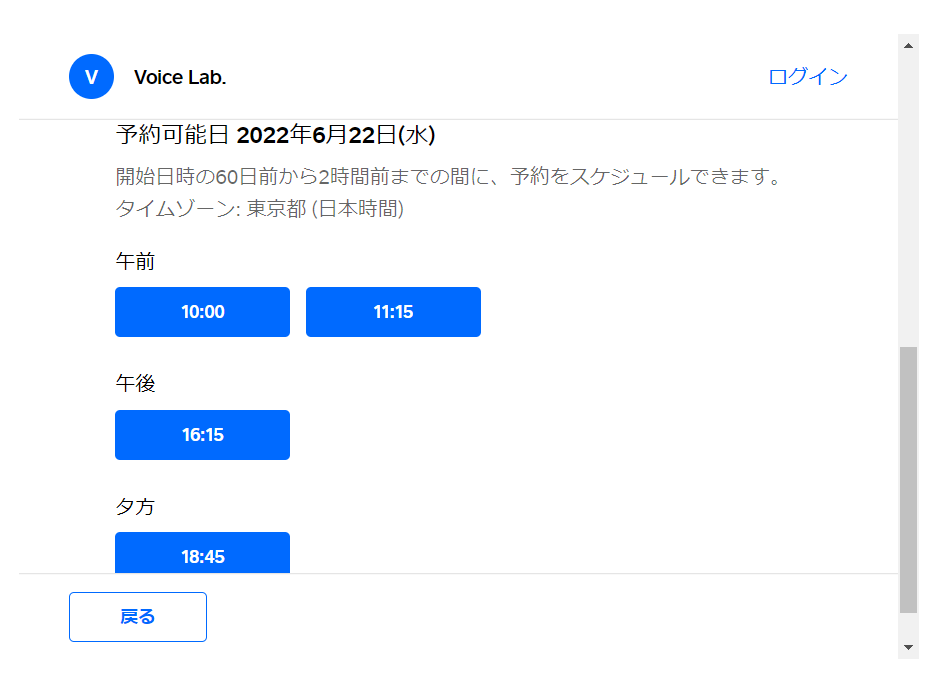 表示されたレッスン枠の中から受講したいものを選びタップします。もし、都合の良い時間帯がなければ、『戻る』のボタンをタップして④のカレンダーに戻ります。そして別の日付を選んでその中に希望のレッスン枠があればタップして先に進みます。ご希望のレッスン枠が見つかるまでこれを繰り返してください。