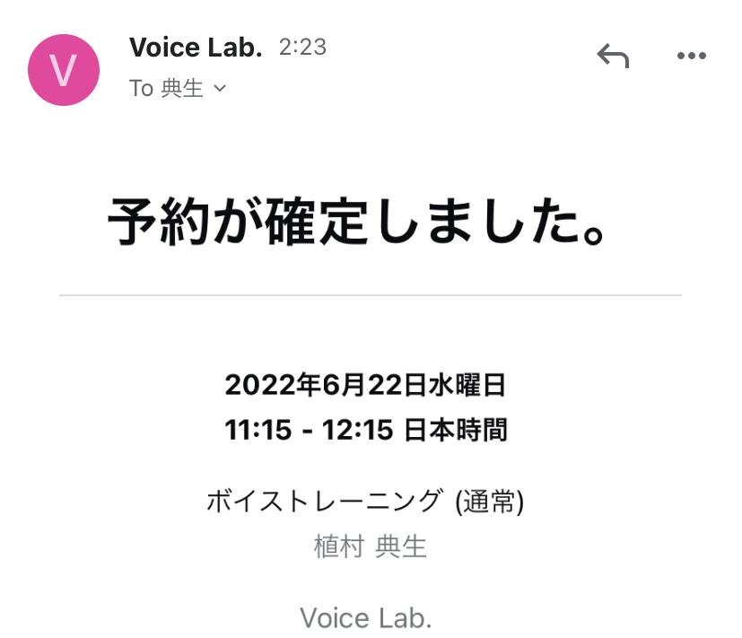 記入されたメールアドレスに、「Voice Lab.が予約を受諾しました」という件名のメールが届きます。これが届かなかったら上手く予約できていない可能性がありますので、その際はお問い合わせください。